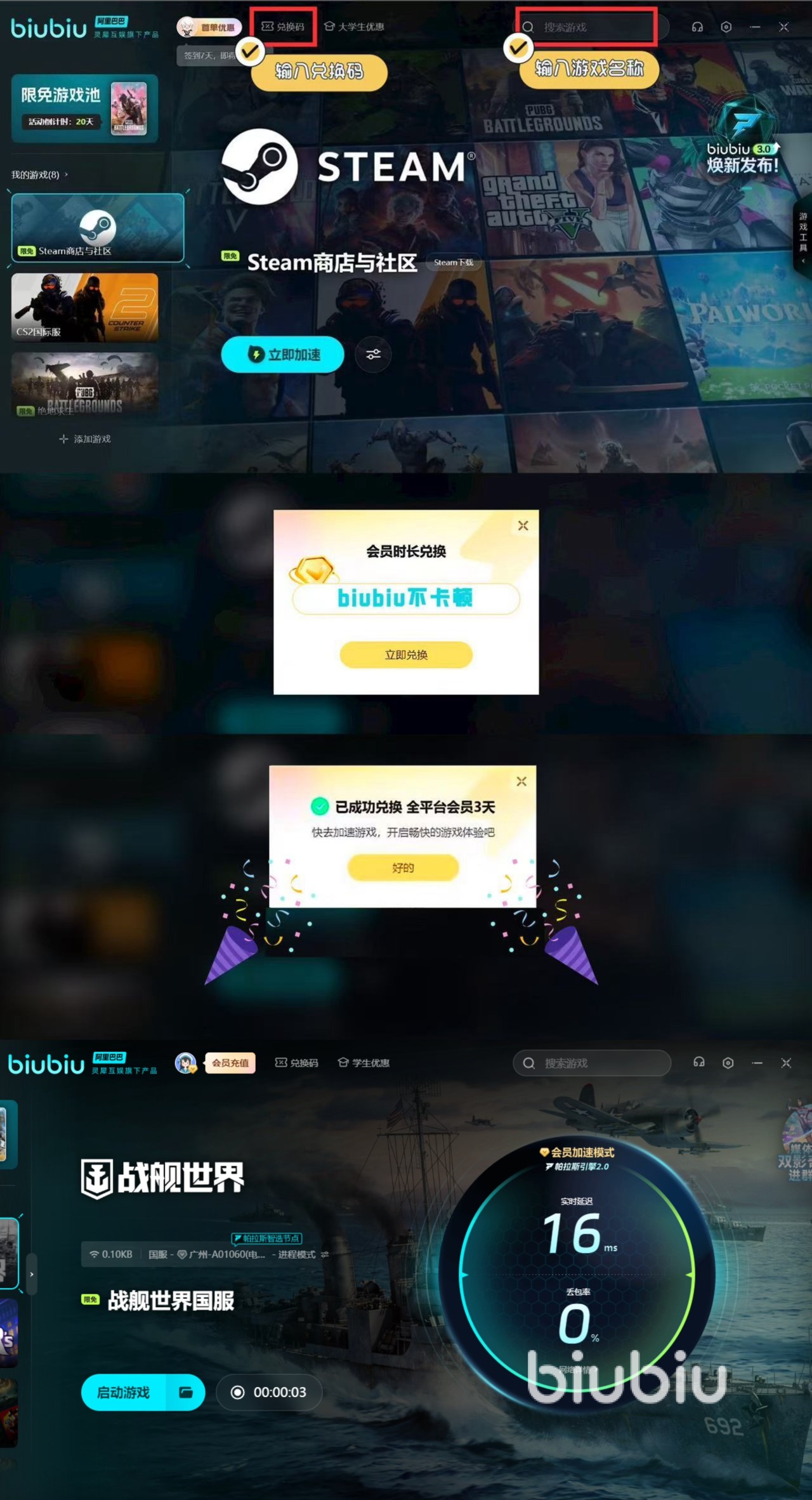 要是大家战斗时太卡的话,就算装配了不同的战舰,也依然不是对方的对手。所以我们可以用上biubiu,有效解决卡顿后,才能发挥自己最大的实力。新用户的话可获得3小时的免费加速,另外新老用户输入【biubiu不卡顿】,又能额外领取三天免费加速。
