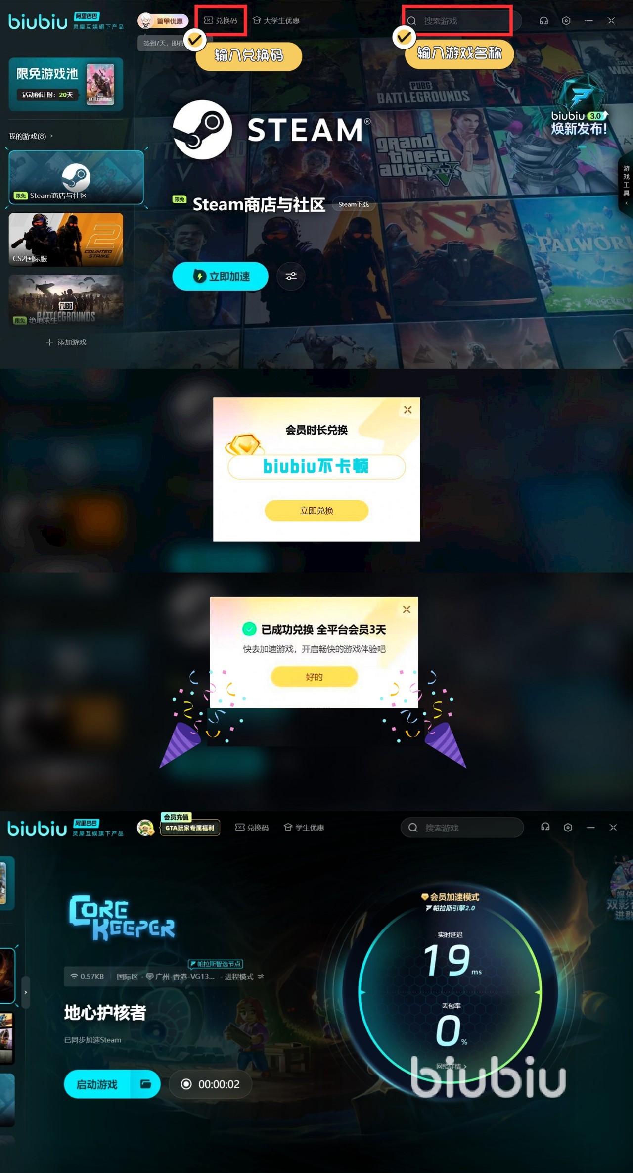 现在新用户注册即可享受3小时免费加速体验时长,此外,新老用户使用兑换码:【biubiu不卡顿】,还能额外领取72小时加速时长,助你无缝对接游戏世界,提升打怪刷图开荒效率。