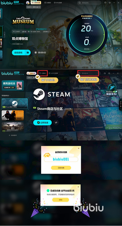 游戏体验时,卡顿和延迟真的是最大的敌人,但现在有了biubiu加速器,不卡网成了可能!新用户一注册就能领取3小时加速时长,保证玩得更流畅!更给力的是,兑换码【biubiu001】还能再送72小时的免费加速时长,无论是新玩家还是老玩家都能轻松享受。搭配使用,足足有75小时的超长加速时长,告别延迟,尽情畅玩!不管是新手还是资深玩家,这波福利绝对不容错过,赶紧领取,一路顺畅到底!