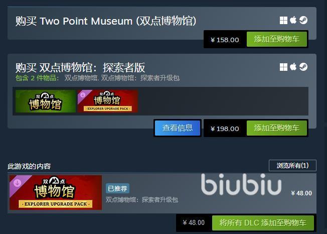 首先,让我们来看一下双点博物馆在不同平台上的售价。目前,游戏已经在多个平台上线,并支持简体中文。国区的标准版价格定为158元,而探索者版的价格为198元。价格相差40元,看似不多,但购买时还是得好好权衡一番。