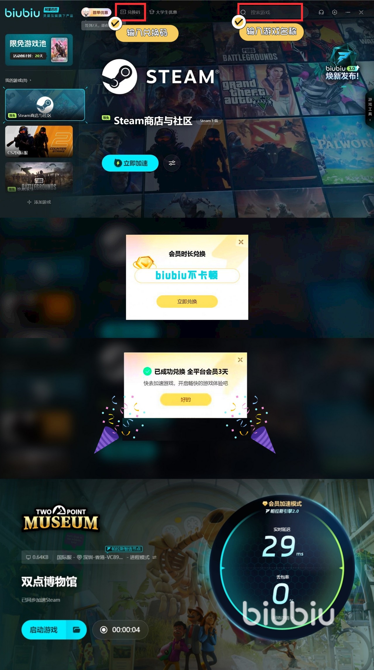 若是玩家想要去解锁更多加速时长,完全可考虑去点击兑换,然后借助【biubiu不卡顿】,就能顺利领取到72h的就是时长,现在所有平台用户都可去通过其对应页面来点击领取到哦。