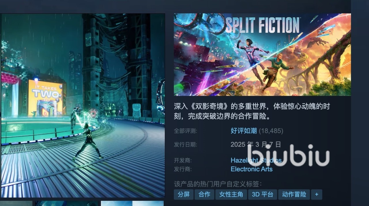双影奇境在Steam上的英文名是 Split Fiction。这款游戏是由《双人成行》的开发商打造的全新力作,延续了前作的合作玩法精髓,同时加入了更多动作冒险元素。如果你在平台上搜索,无论是输入“双影奇境”还是英文名称,都能找到它。