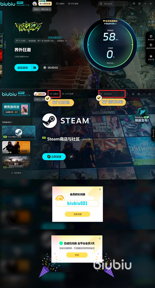 玩家如果是在下载游戏时遇到卡顿的现象,这基本上都是网络不顺畅,所导致可以用加速器来解决问题。biubiu加速器可以稳定网络速度,减少卡顿以及延迟。现在还有免费加速时长可以领取,新用户第1次注册就有一个3小时的免费礼包。使用兑换码【biubiu001】还能重新额外解锁72小时,这两种方法如果叠加起来就可以免费75小时。