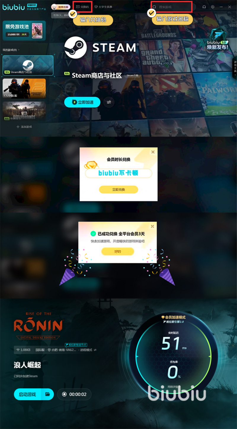 如果想在游戏中进行收刀,那么操作起来也是比较简单,只需要长按R1,再加上R3就可以进行这样的操作了。而且要注意,如果这时刀上是有血迹的时候,进行此操作还会进行振刀,出现的收刀动作是随机的。这样的操作在战斗中可以直接使用出来,非常炫酷。如果大家感觉自己的战斗不流畅,无法打出应有的效果,那么可以通过biubiu加速器来进行优化,只需要注册一个新biubiu号,就能直接得三小时会员时间,每个号还都可以通过输入兑换码【biubiu不卡顿】,去获得72小时会员时间。这样再战斗起来就会更加流畅,随心所欲了。