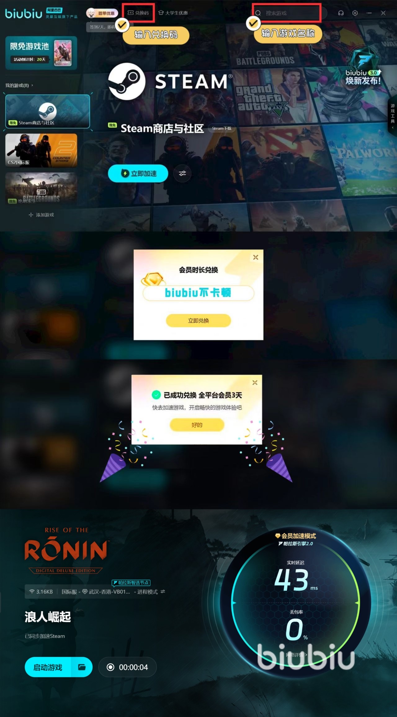 有些玩家在后续的战斗会特别卡顿,导致战斗的时候被boss直接击杀,那为了避免频繁地卡顿,可以使用biubiu加速器进行全面加速,同时新人在注册后便获3小时免费加速,新老用户均可使用兑换码【biubiu不卡顿】可获3天免费的使用权哦!