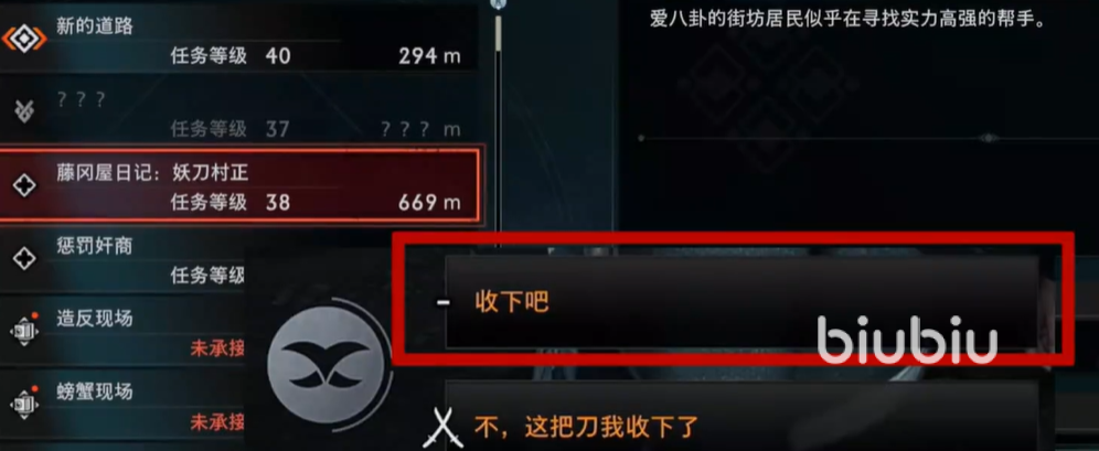 妖刀村正支线任务的流程整体没什么难度,当接取任务以后,玩家们就会在任务地点京都的白川山上完成支线,其路线都有任务的指引,而且没有强力的boss很容易就能完成的,但是这个任务是有隐藏选项的,很多玩家都会错过这个选项。
