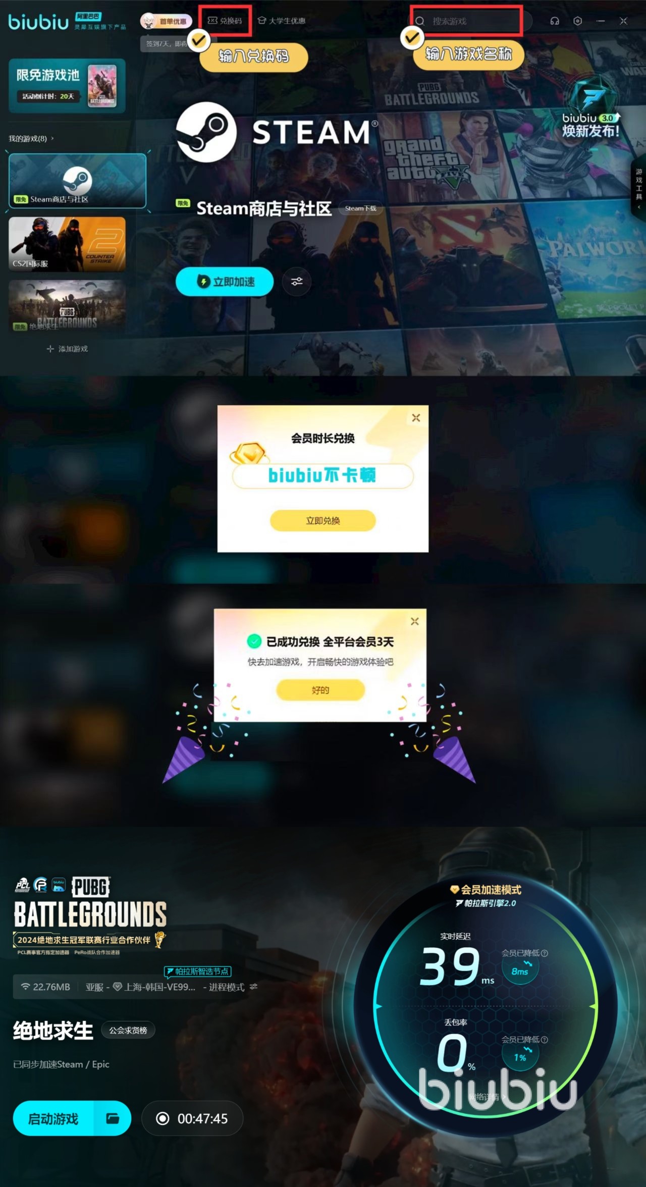 PUBG多数玩法就是在大逃杀,在100人的生存战争中,可以选择躲避敌人的抓捕,在一个安全的房子勾着,等着毒圈慢慢消灭几人,从而进入决赛赛获得比较好的名次,也可以选择成为猛干玩家,向周围的敌人全部击杀,夺取身上高价值的装备从而成为第一名,从而体现自己的技术,但是有些玩家在射击总是卡顿,根本杀不死人,这大概率是网络延迟过高导致的,那么选择biubiu加速器就能保持低延迟,同时新人在注册后便获3小时免费加速,新老用户均可使用兑换码【biubiu不卡顿】可获3天免费的使用权哦!