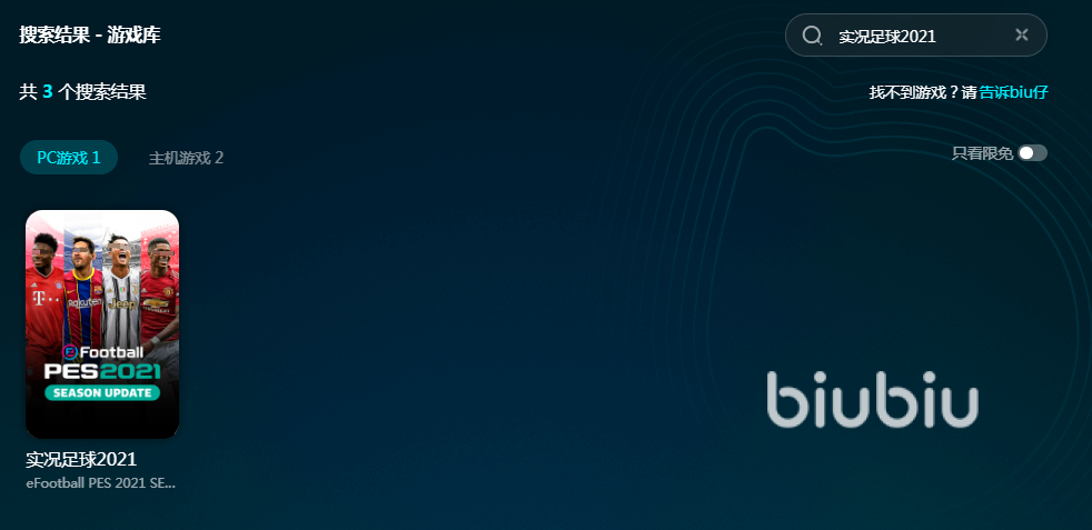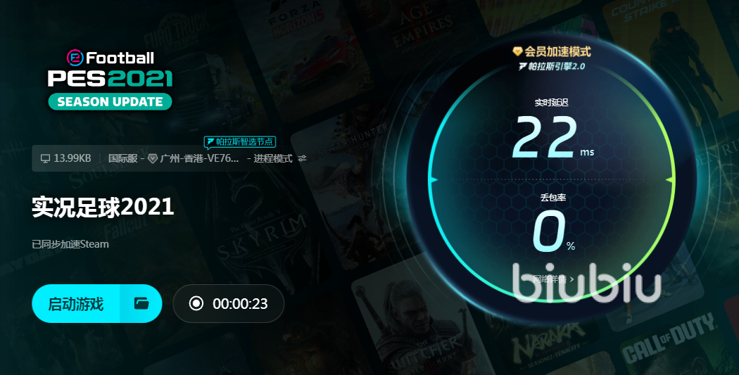 biubiu加速器支持免费试用,注册新用户就能获得3小时免费加速时长,接下来还能输入兑换码【biubiu不卡顿】来领取三天免费加速。它能加速非常多游戏,在软件里搜索游戏名就能看到实况足球2021的加速资源,玩游戏之前只要点击一下蓝色按键就会启动加速了。