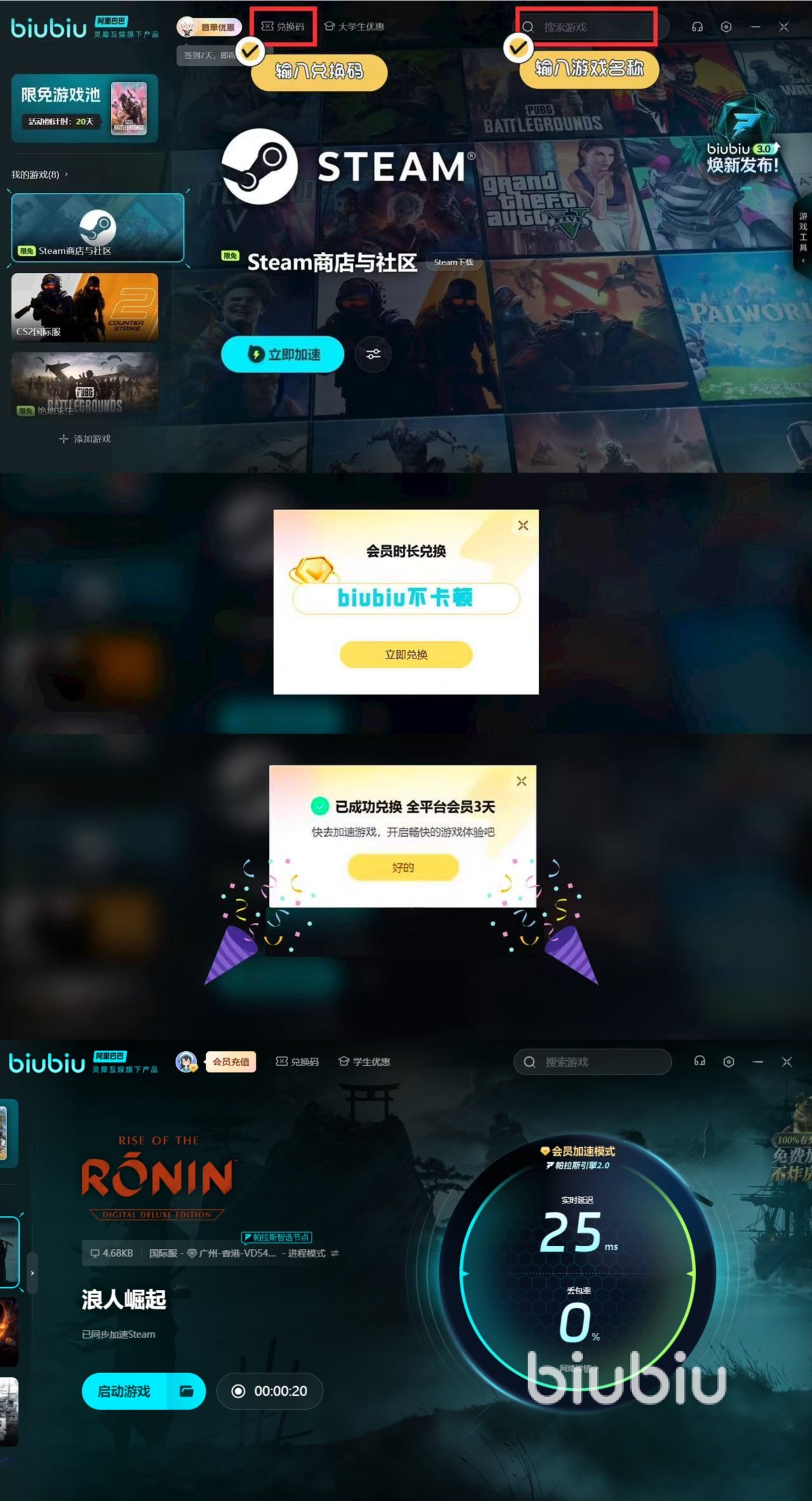 不过我们在寻找道具的途中,如果发现网络太卡的话,就会影响我们的节奏和脚步。这时建议大家用上biubiu,网络变好后才能继续寻找道具。新用户的话可获得3小时的免费加速,另外新老用户输入【biubiu不卡顿】,就能额外领取三天免费加速。