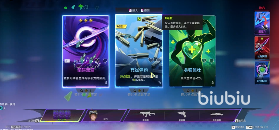 恩费卡:根据投入点数产生阶梯效果(例如投入1点增加移速,3点解锁瞬移能力)。