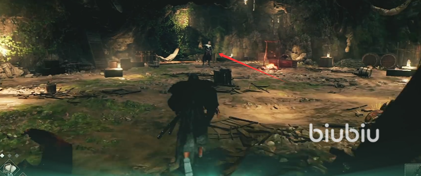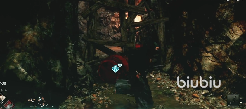 下到悬崖底部还要再翻过这座山,才能找到标记的大概位置,然后找到图中的这个山洞,击碎木桶则会炸开洞口的障碍物。洞穴不深,进入后拐个弯就能看到里面的BOSS“闭眼武士” 了。