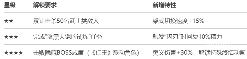 若卡关“闭眼武士”,可尝试携带“寒冰子弹”降低其攻击速度。三段架式的融合机制,是将《仁王》经典的上、中、下三段架式整合为单一流派,通过“闪刃”系统(类似《仁王》的残心)实现架式间能量流转。并且后续该技能的升级还需要以下的条件: