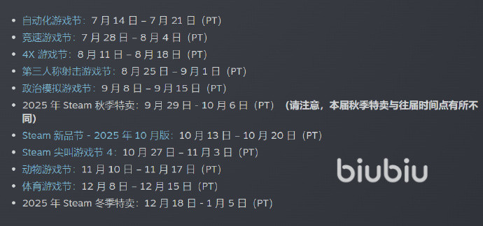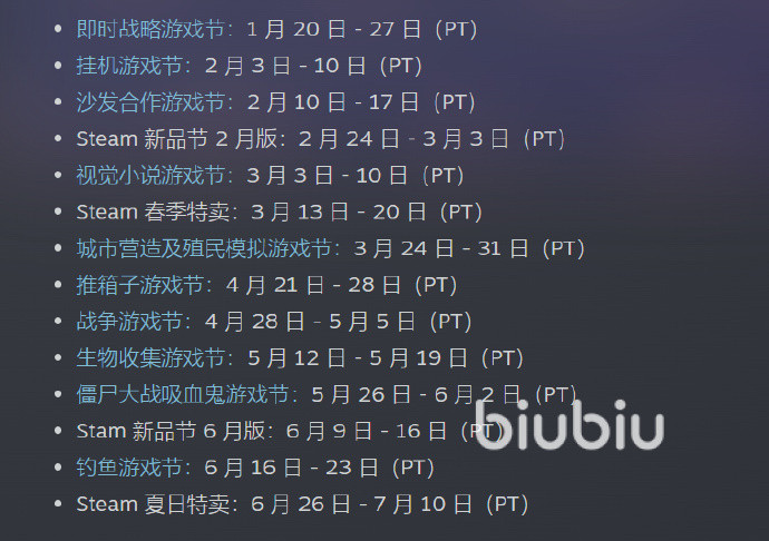 总而言之,即使Steam春促大家没赶上,但你的游戏之旅也才刚刚开始。上面的本年度安排时间表大家可以收藏起来,方便查阅。另外注意图上的时区PT,并非北京时间哦。最后各位可以持续关注本站报道的最新促销活动,并用biubiu加速软件为你的游戏体验保驾护航吧!