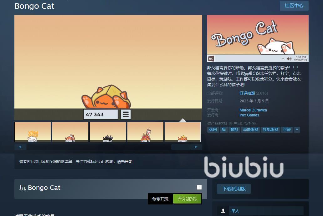 以上就是BongoCat怎么下载的内容了。Bongo Cat以极简的操作方式和极具互动性的玩法,为玩家提供了一个既有趣又可爱的体验。不管是用来打发闲暇时间,还是作为主播的直播工具,它都能在不同的场景中带来无限欢乐。