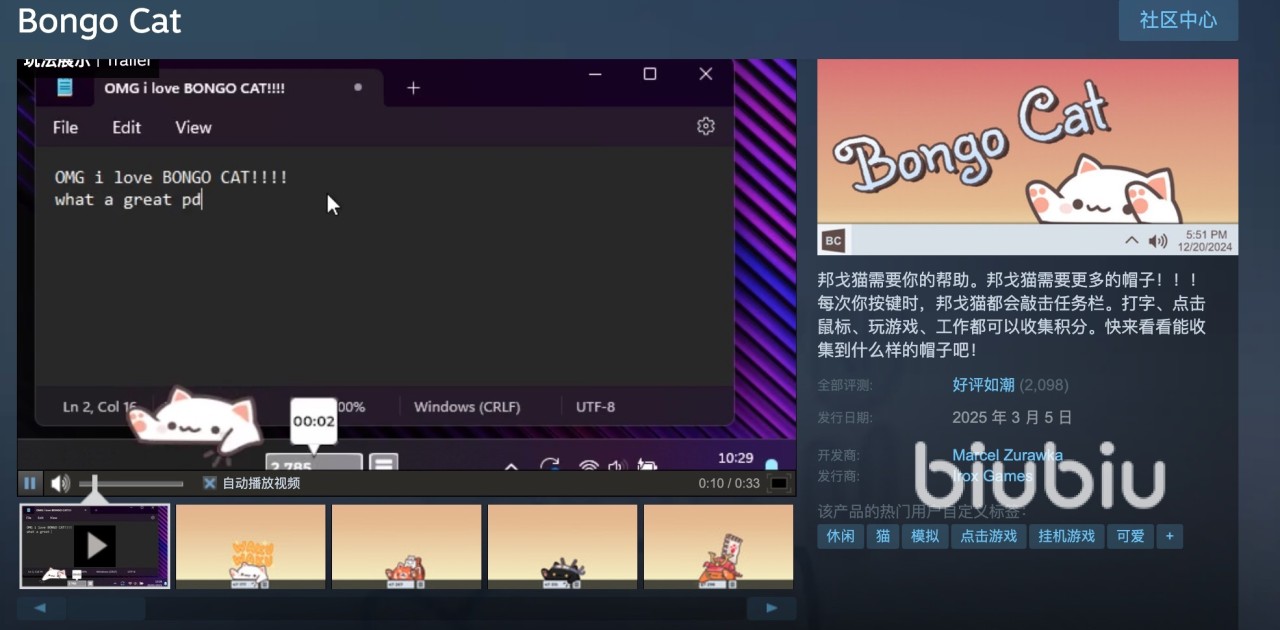 总而言之,它是一款既有趣又可爱的放置类游戏,不管是用来打发闲暇时间,还是作为主播的直播工具,它都能在不同的场景中带来无限欢乐。快来用biubiu下载BongoCat,享受与猫咪的亲密互动吧!