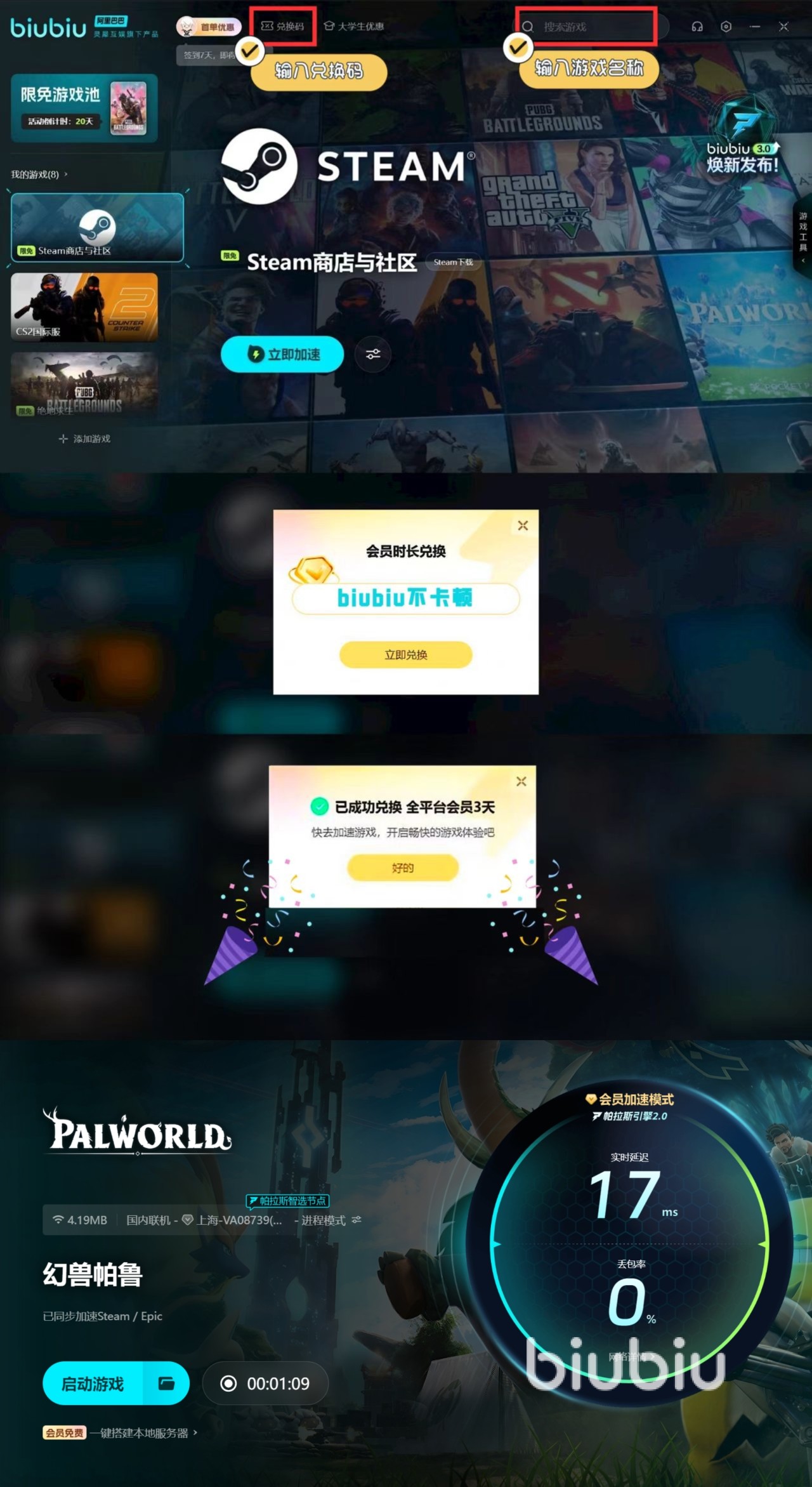 幻兽帕鲁在探索的旅途中,可以见识到不同类型的帕鲁,而玩家就可以选择一个比较安全的地方建造营地,将收集到的帕鲁放到营地内进行建造,让家园的设施和产出直线提升,而有些玩家会邀请其他玩家一同搭建家园,就是联机的过程中总是掉线,导致两个人的游玩体验很糟糕,那么就可以使用biubiu加速器,能有效让掉线问题得到解决,同时新人在注册后便获3小时免费加速,而且新老用户均可使用兑换码【biubiu不卡顿】可获3天免费的使用权哦!