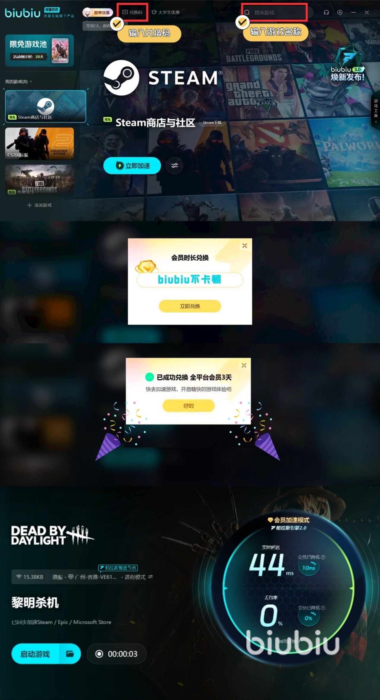 黎明杀机还是比较专注于pvp的,虽然双方人数不太统一,但是对于技术的要求还是比较高的, 作为鬼方需要灵活地掌握人类的位置,从而利用鬼的技能和高端技术将所有人类抓死,而人类就需要设法逃跑,还可以帮助被抓住的对手,从而安全逃生,博弈性拉满的,而且恐怖氛围也塑造得比较真实,但有些玩家特别容易卡,那么可以使用biubiu加速器来稳定网络,同时新人在注册后便获3小时免费加速,而且新老用户均可使用兑换码【biubiu不卡顿】可获3天免费的使用权哦!