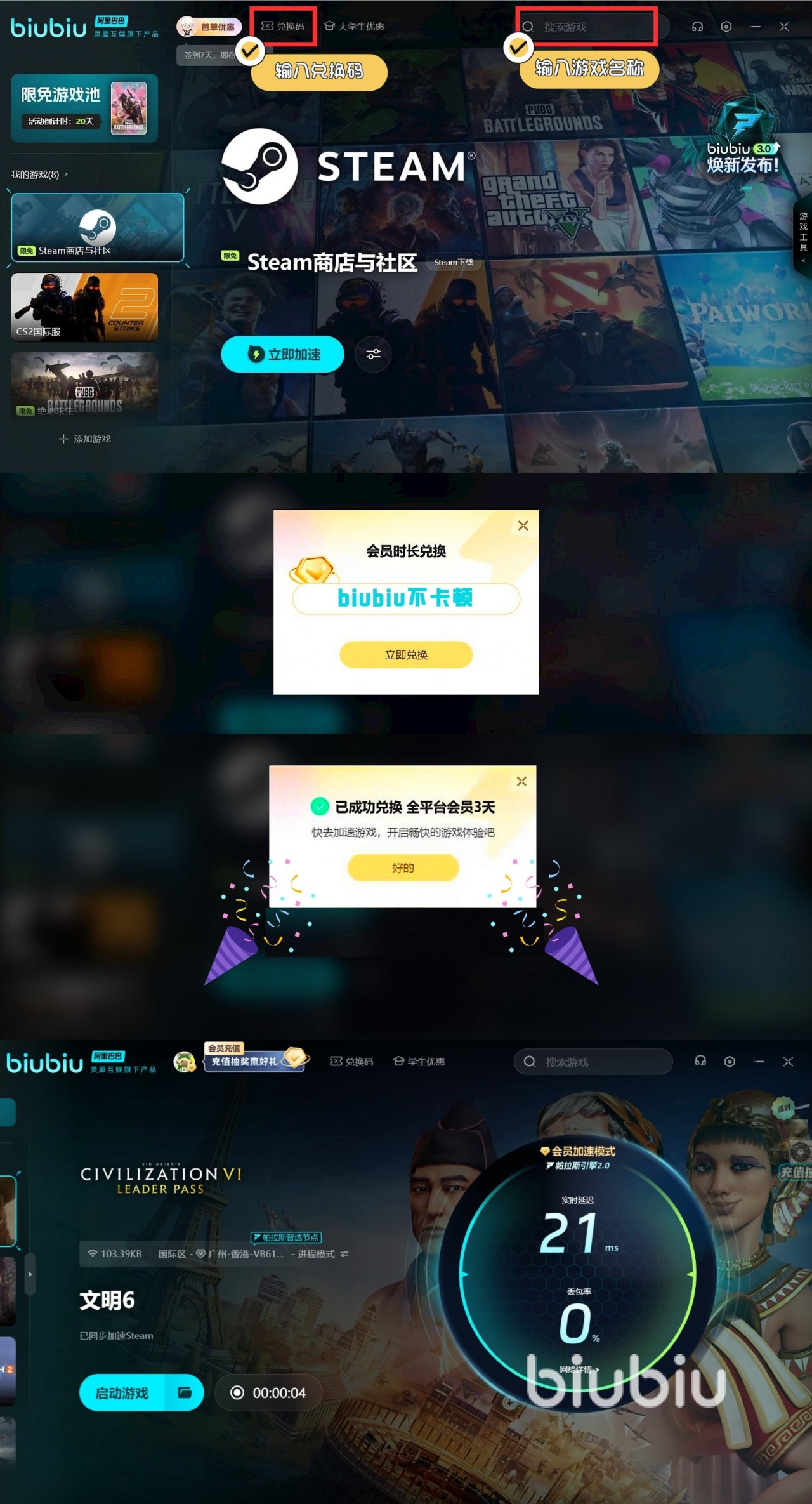 对于新用户而言,注册后即可获得3小时的免费加速时长,能够快速体验到biubiu加速器的强大功能。更令人惊喜的是,新老用户只要输入【biubiu不卡顿】兑换码,就能额外领取三天的免费加速时长。在游戏中,进攻敌方大本营是关键环节,若此时网络卡顿,很有可能导致自己的军队全军覆没。用上biubiu,如此便能放心地应对各种突发战事,避免因网络延迟而做出错误决策,确保战斗的顺利进行。