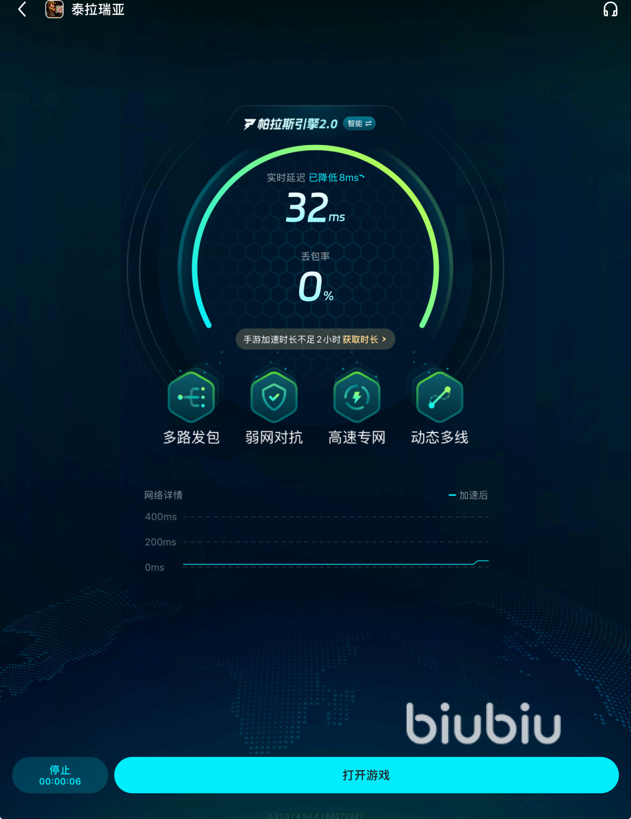 由于《泰拉瑞亚》开放的是国际服,所以大家需要借助biubiu加速器的全球专线来实现稳定连接。在移动端使用biubiu加速器时,玩家通过观看小视频就可以免费获得加速时间,十分便捷,每天还能叠加到最多24h。