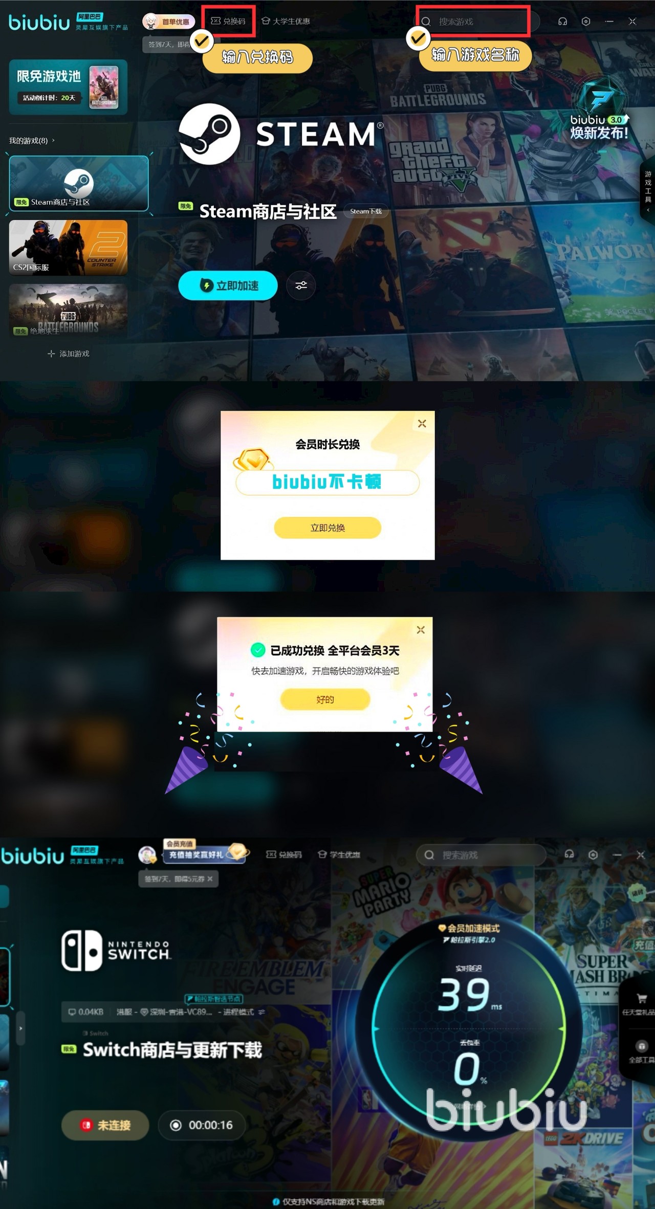 目前市面上大多数的游戏都能够在biubiu中找到,同时也支持多区服的网络优化服务,非常省心。对于之前从未用过,仍在考虑是否下载的小伙伴们可以点击文章链接进行下载,使用新用户注册福利领取3小时的免费时长前去体验,如果觉得没有过瘾,还能用【biubiu不卡顿】兑换码获得3天加速时长。