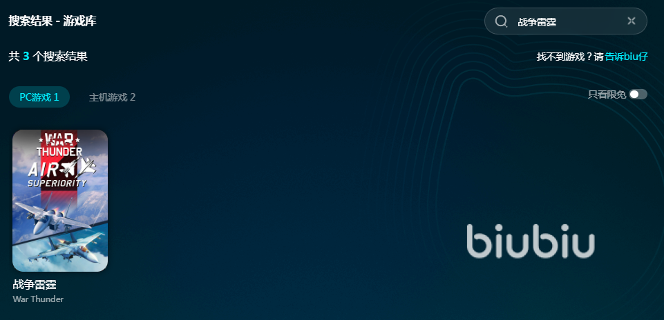 biubiu是非常专业的游戏加速器,可以加速上万款游戏,范围包括国内游戏跟海外游戏。软件收录战争雷霆三款加速资源,其中2款主机游戏是限免加速的。注册成为新用户就能获得3小时免费加速,对新用户限免意犹未尽的小伙伴只要输入【biubiu不卡顿】,也能得到3天免费加速。