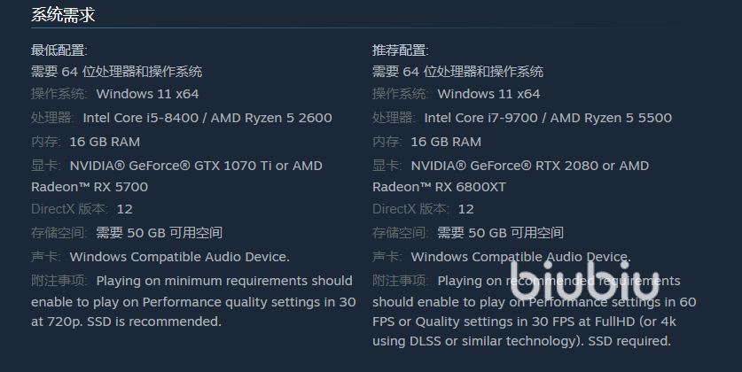 此外,无论选择何种配置,都需要预留50GB的存储空间来安置游戏文件。具体推荐配置详情如下: