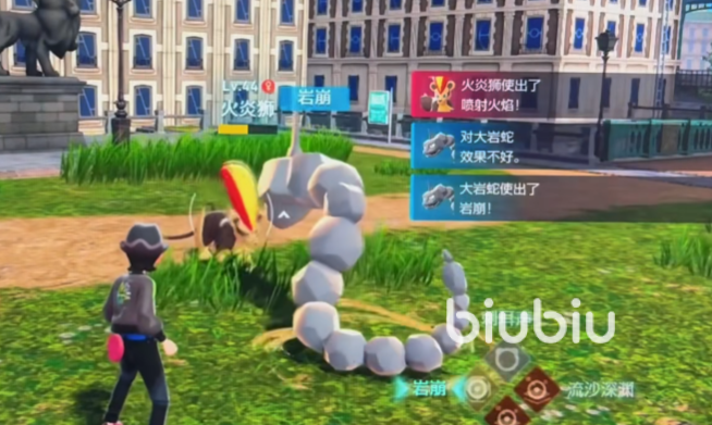 这里还加入了特殊的战斗系统,那就是摒弃了以前的回合制战斗。玩法,我们可以通过操控训练师让所有的宝可梦跟我们肩并肩的移动,如此便可一边走位一边释放技能并躲掉敌人的关键技能。总之变成了即时战斗玩法,然后还有丰富策略可选。