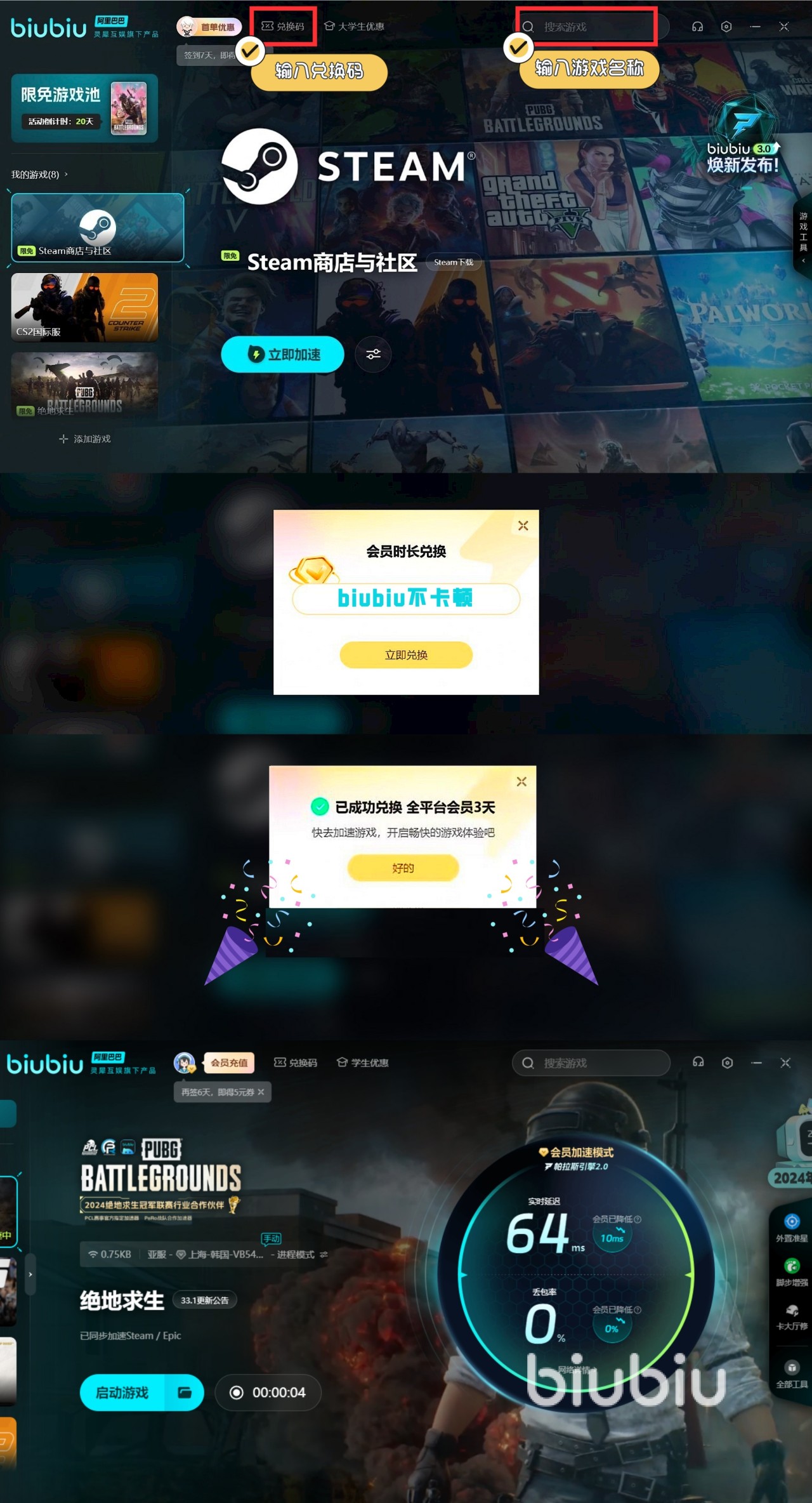 对于一些希望能解锁更多加速时长的朋友,到时还可主动去点击界面中的兑换按钮,然后输入【biubiu不卡顿】,如此所有平台用户都能领取到72h的加速福利哦。