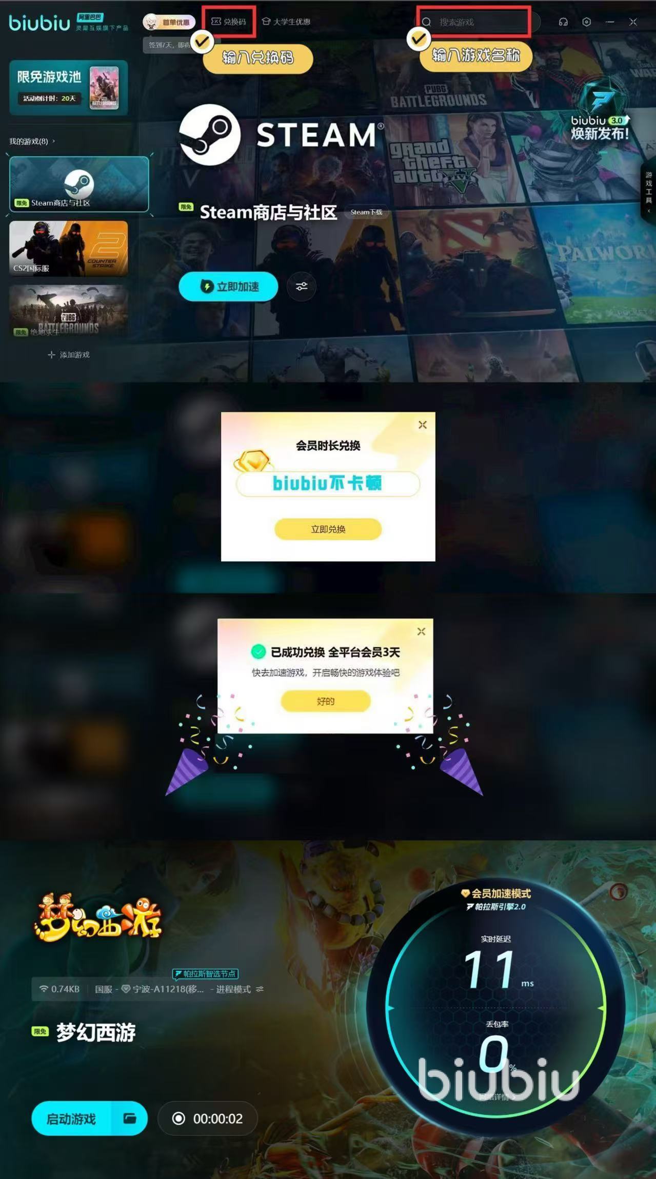 在最后再给玩家们分享下biubiu上的加速福利领取过程,通过图片的方式能更加直观的了解领取的步骤: