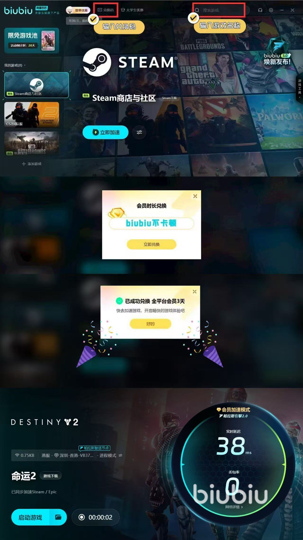 想要体验biubiu的话,可以使用加速器推出免费加速福利活动。比如说新用户在注册和登陆后可以直接获得3h的加速,利用“biubiu不卡顿”这个口令可以获得3天的加速。如果说玩家还是在校大学生或者研究生的话,可以利用学信网证件号通过学生认证,然后享受一次超低折扣的加速器VIP充值活动。