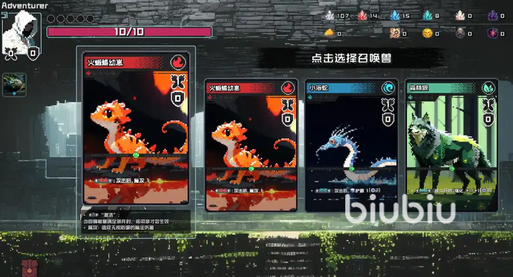 游戏的卡牌玩法是比较有趣的,在前期可以使用低阶的卡牌挑战怪物,从而通关房间获得指定的生物卡或者支援卡,然后通过这些卡组建立一套相对完整的体系,随着后期关卡的变高,玩家就可以将部分卡牌进行融合,这样就能进化出一张高阶的生物牌。
