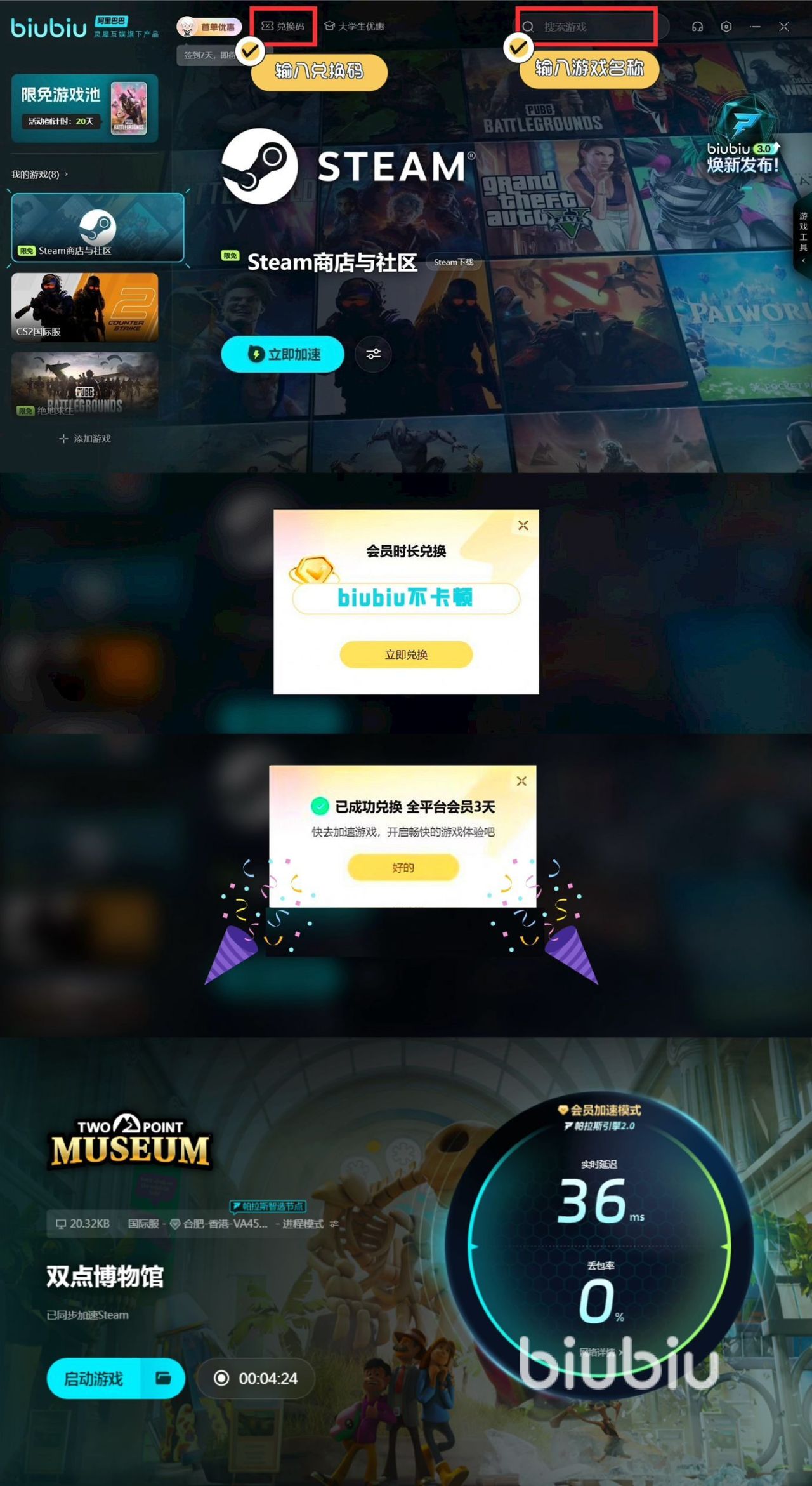 在畅玩的过程中可能会遇到网络问题。大多可以尝试使用加速工具来优化网络连接。新用户注册即可享受3小时的免费加速特权,而新老用户则都能通过领取【biubiu不卡顿】优惠券来获得72小时的加速时长。新用户叠加使用,总共可享受75小时的加速时长。