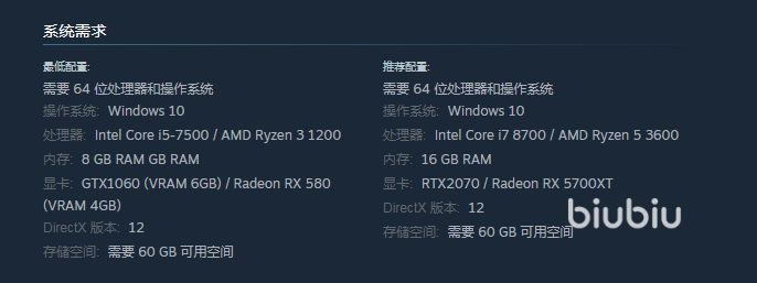 操作系统可以选择 Windows 10,处理器可以选择AMD Ryzen 3 1200,在内存上也需要有所保证,可以关注8 GB RAM,另外在选卡这方面也需要注意,可以选择GTX1060 (VRAM 6GB)。