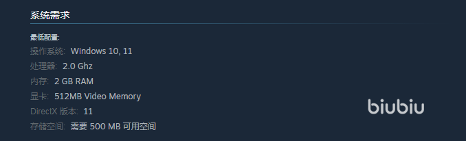 要想满足最低的配置,在操作系统上面可以选择windows10或者是windows11,处理器方面可以选择2.0 Ghz,另外还需要注重显卡的选择,显卡可以选择512MB Video Memory,别忘记还需要准备好足够的内存空间,但这款游戏所需要的内存空间大概是500 MB 可用空间