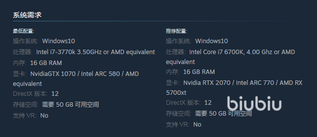操作系统可以选择 Windows10,处理器这一方面有两种选择,这里推荐大家选择AMD equivalent,还有显卡的选择是比较重要的,玩家可以选择Intel ARC 580 / AMD equivalent,别忘记在储存方面需要保证拥有50 GB 可用空间。