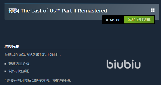 现在游戏已经开启预购,预购价格为345元。玩家如果选择预购就可以先获得以下的项目,例如弹药容量升级,还有制作训练手册等等。要比其他的玩家在游戏中更有更多的优势。
