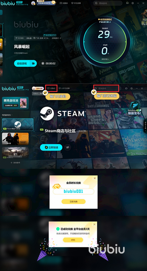游戏的环境变动,还有服务器的不稳定,都可能会导致下载的速度变得比较缓慢。玩家要想避免这问题,可以通过网络加速器来解决。biubiu加速器现在还会有免费加速活动,喜欢薅羊毛的朋友就别错过。对新用户而言,就可以获取长达75小时的加速时长。有一个3小时的免费礼包。还可以通过通用兑换码【biubiu001】领取72小时的加速时长,赶紧跟着一起来了解一下。