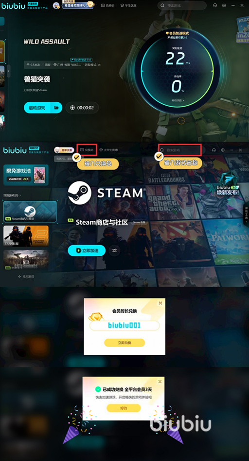 除了这些问题之外,闪退卡顿延迟的出现和网络的稳定性也有关系,要想保证网络的顺畅,不如就选择一个加速器。biubiu加速器拥有一键加速的作用,能避免这些问题,现在还有免费加速时长可以领取,新老用户都不要错过。每一个用户都可以使用兑换码【biubiu001】得到一个长达72小时的免费加速时长。新手用户还有一个3小时的新手礼包,如果能够结合在一起使用,就能免费75小时。