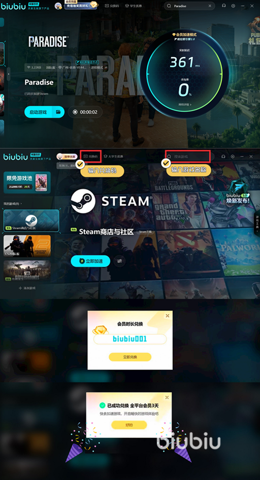 除了这些方法之外,玩家也可以选用一个网络加速器,网络的卡顿可能会导致游戏闪退或者是卡顿延迟,这里推荐一款biubiu加速器,点击以上的链接,新用户在完成下载之后可以免费3小时。此外还可以申请延长免费加速时长,在加速器的页面复制口令【biubiu001】能延长72小时,两者可以叠加使用,一共是免费75小时。
