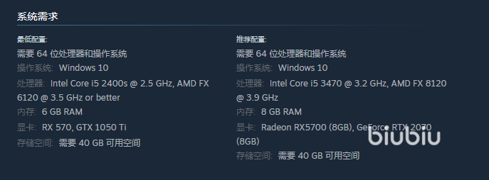 要想体验这款游戏就需要满足最低的配置,需要64位处理器,还有操作系统,操作系统可以选择Windows 10,此外还需要选择处理器,处理器是选择Intel Core i5 2400s @ 2.5 GHz,,显卡方面可以选择RX 570, GTX 1050 Ti,储存空间没有太多的限制之处,一般满足40 GB就已经足够。