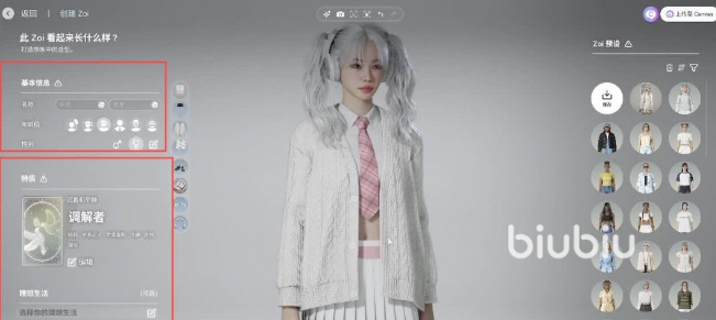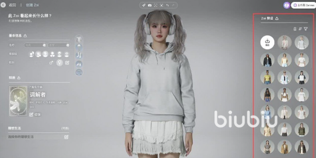 进入游戏之后可以看到右边就有一个预设的选项。如果是自己捏出来的外形,也可以通过上传的方法直接保存在这。左边主要是选择年龄,还有性别。