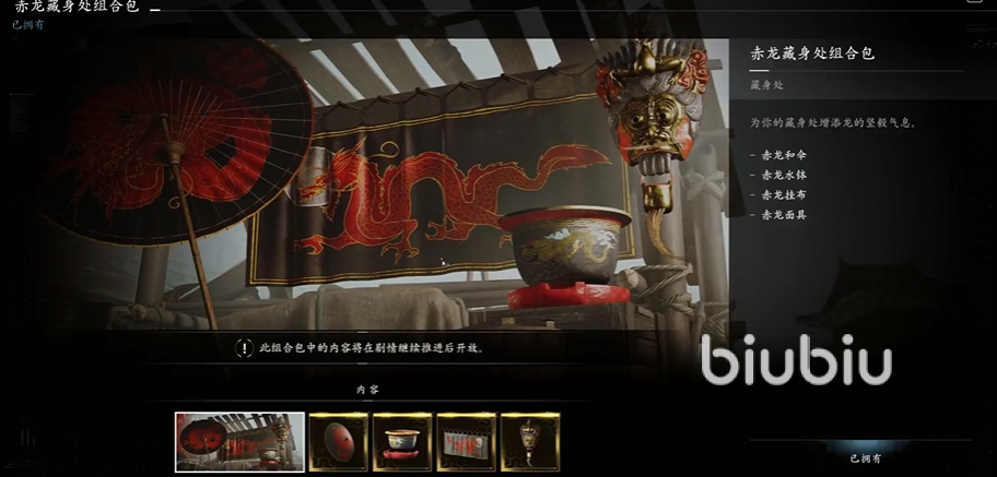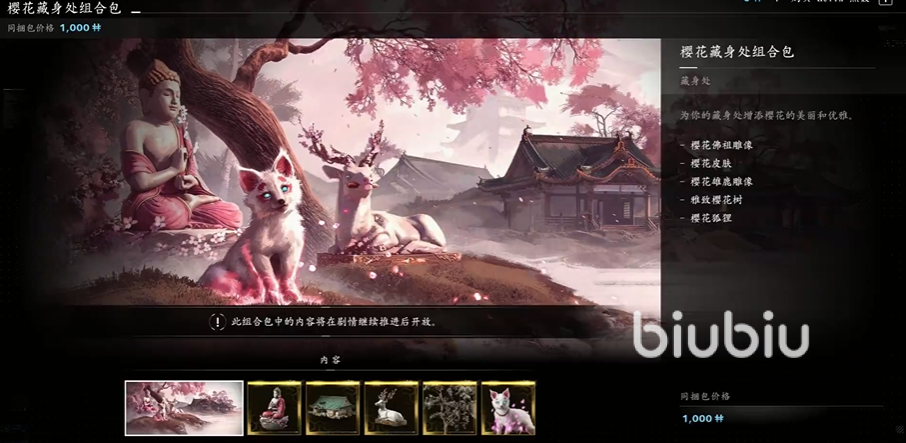五、藏身处:玩家可通过Helix商店购买或游戏内获取装饰道具,用于自定义基地建筑。有四款主题,分别是盈虚、樱花和赤龙,不同的是还有一个专门的宠物包组合,售价800H,其他几种售价相同,均为1000H,里面有雕像皮肤、树的皮肤、宠物皮肤等。
