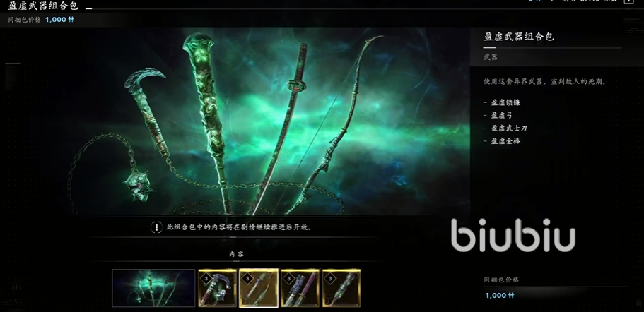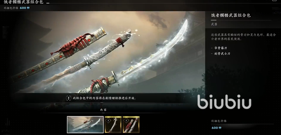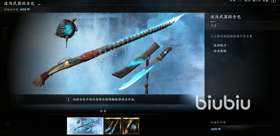 三、武器组合包:分为饿者骷髅、波涛、盈虚、赤龙4个主题,饿者骷髅、波涛和赤龙包里都是两把武器,售价600Helix,而盈虚包里是4把武器,售价1000Helix。