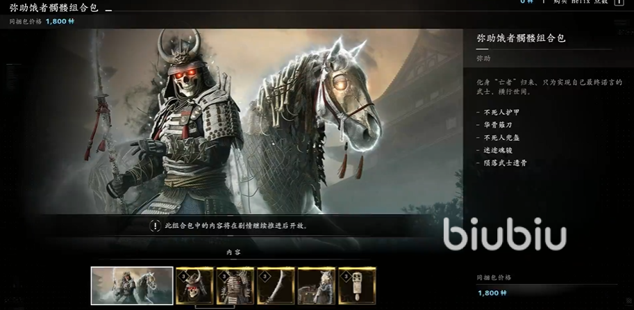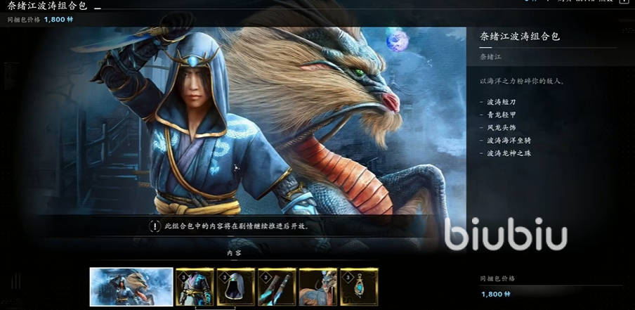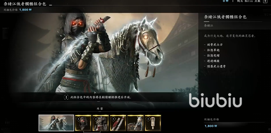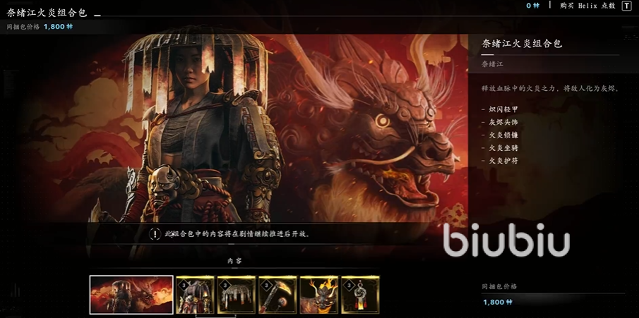 一、奈绪江角色组合包:有火炎、饿者骷髅、波涛、赤龙四个主题的组合包。内含武器、头、甲、坐骑、配饰5件物品。售价均为1800Helix。