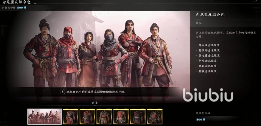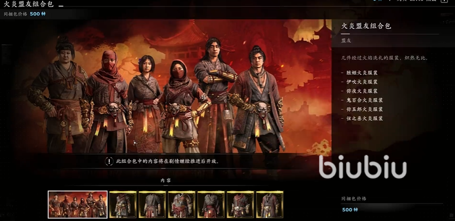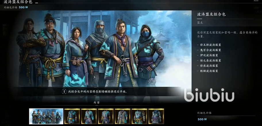 六、盟友:有火炎、赤龙、波涛三个主题包,里面是6套盟友的衣服。