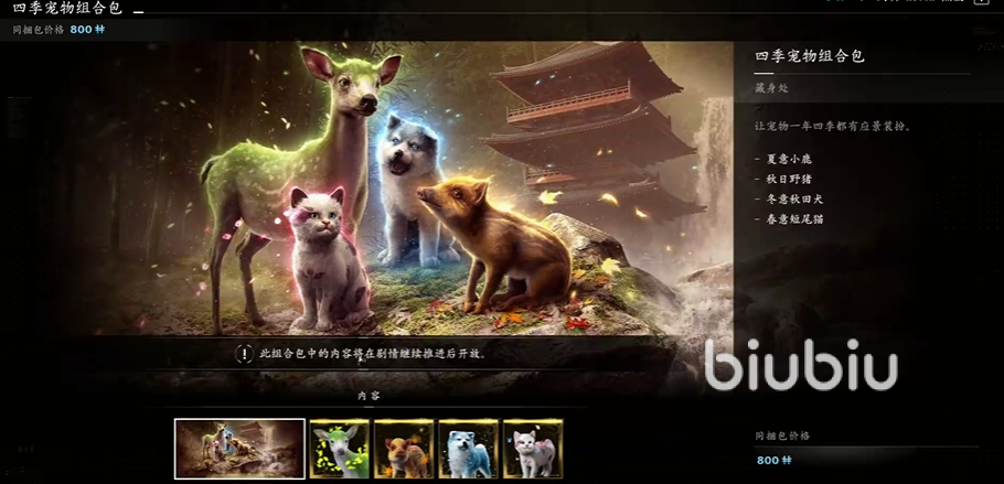Four Seasons Pet(四季宠物组合包):售价600 Helix,玩家可购买宠物作为冒险伙伴。很多玩家还期待宠物能与剧情互动,例如根据任务表现影响宠物行为或解锁特殊剧情分支。