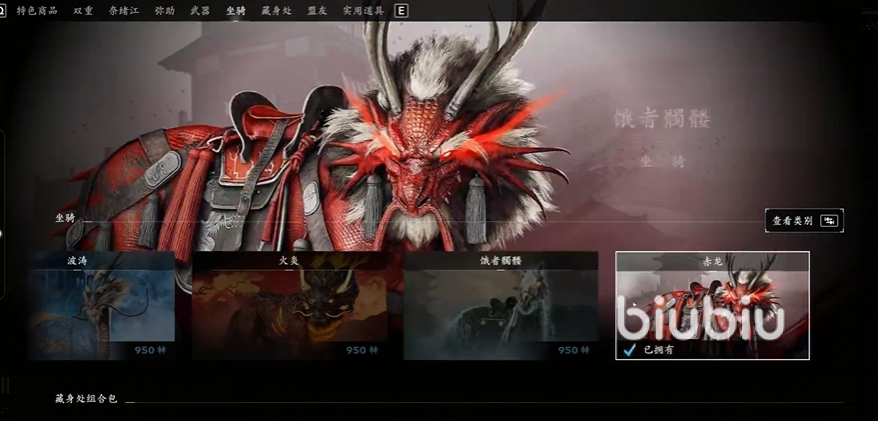 四、坐骑:里面是单独的坐骑不含其他内容,每个坐骑售价950Helix,仍然是火炎、饿者骷髅、波涛、赤龙四个主题。