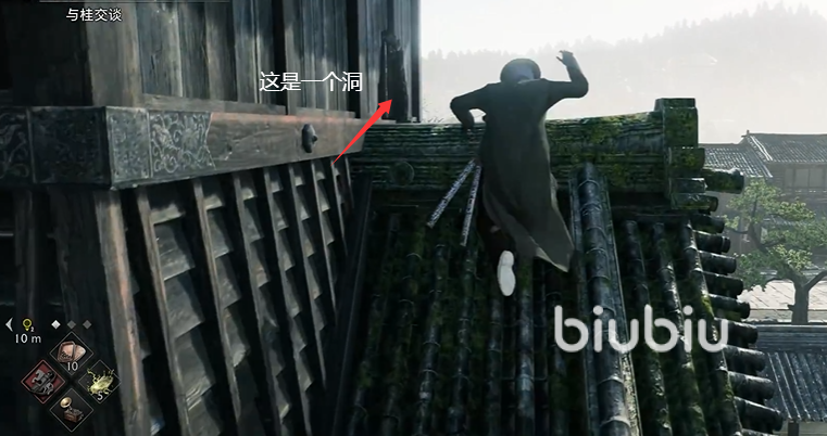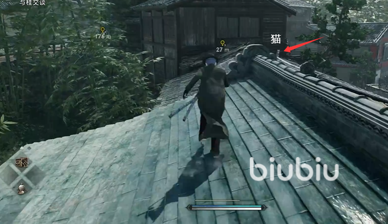 然后去找另一只猫,从神社出来,上房,沿着一排房子屋顶一直走,下图这个位置就能看到另一只猫了。