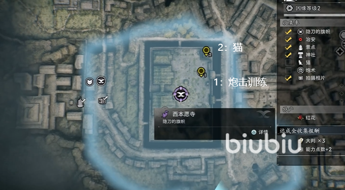 击杀完6个敌人2个高手,治安事件就完成了。剩下的地图只剩下一个隐刀的旗帜、一只猫,还有一个炮击训练。