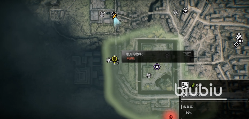 出发点可以是任生地图下方的旗帜,然后第一个目标是下图的隐刀的旗帜。不是很远,直接上马出发,直行就到了。